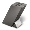 Messenblok, Victorinox, Swiss Modern. Zwart beukenhouten blok. Ruimte voor 6 Swiss Modern artikelen met walnoten heft: 2 steakmessen, klein koksmes, santokumes, trancheer-/koksmes & broodmes.